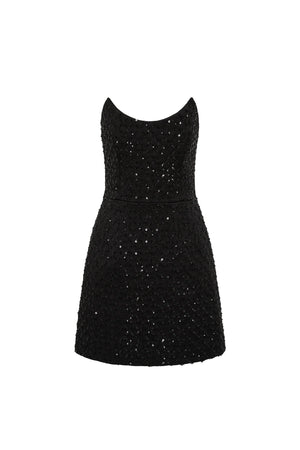 The Neve Mini Dress commands attention with its striking black silhouette and intricate sequin embellishments. Featuring a strapless scoop neckline and fitted bodice reinforced with internal boning, this dress sculpts and supports your figure beautifully. The cinched waist flows into a graceful tulip mini skirt that celebrates feminine curves, while a discreet back zip ensures a polished finish. Fully lined for comfort and confidence, this is the dress for unforgettable evenings.