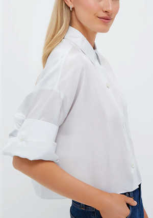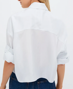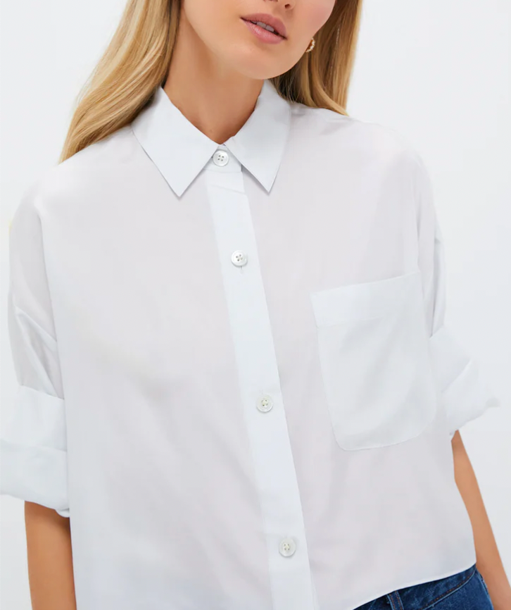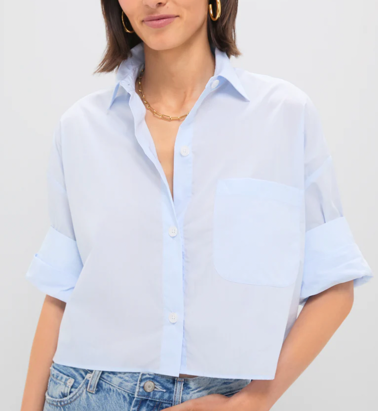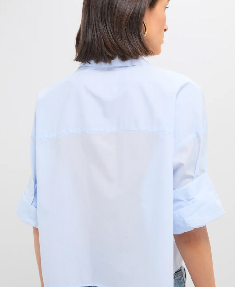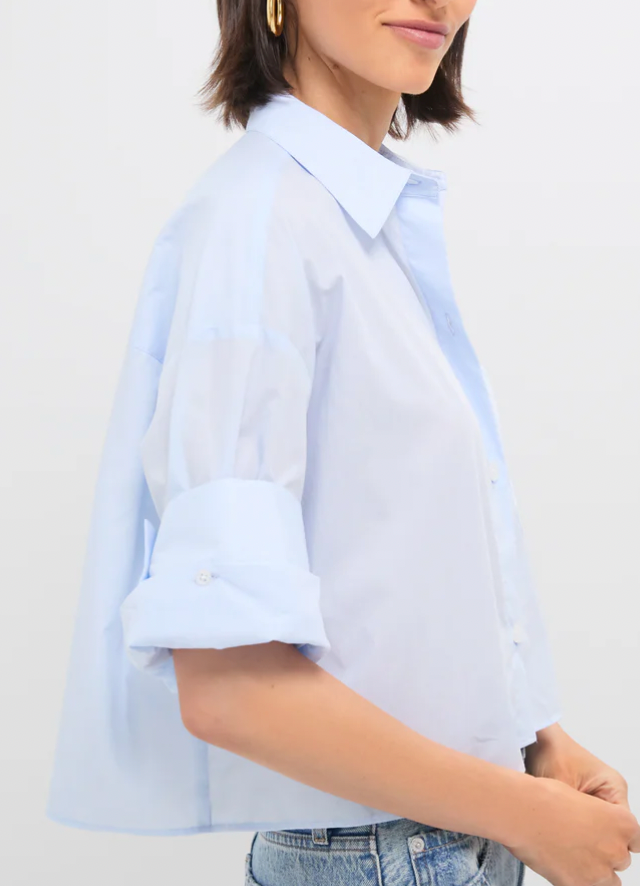 The Baby Blue Next Ex Shirt features a cropped, boxy fit with a spread collar, front button placket, and a chest patch pocket. Its double roll button cuffs add a refined touch. Crafted from 100% cotton and recommended for dry cleaning, this shirt pairs effortlessly with wide-leg denim and flats for a sophisticated, modern style.