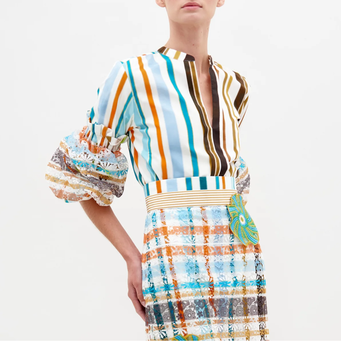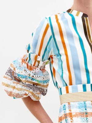The Nuru Blouse from Silvia Tcherassi combines a deep V-neck design and 3/4-length voluminous sleeves with a multi-color striped print, for a stylish and versatile look.