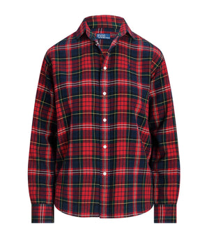 This Polo Ralph Lauren plaid shirt features a box-pleated back yoke and dropped shoulders that create a sophisticated, relaxed silhouette. Crafted from soft cotton, it is designed with a spread collar and a timeless red multi plaid pattern, blending classic charm with understated elegance. Perfect for a polished yet effortless look.