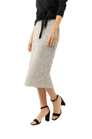 Elevate your holiday ensemble with this sophisticated tea-length pull-on skirt adorned with shimmering silver sequins. Crafted from a blend of polyester and elastane, it offers a comfortable stretch fit that moves with you effortlessly. Perfect for festive occasions, this skirt adds a subtle yet striking elegance to your wardrobe, ensuring you shine with understated glamour throughout the season.