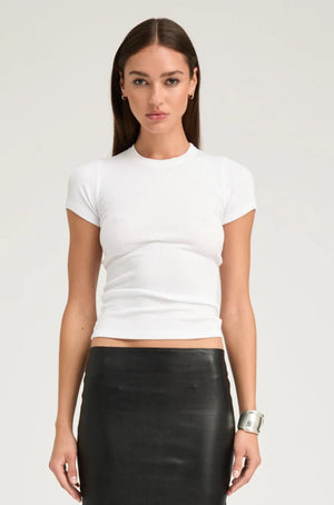 The Rib Baby Tee is a timeless essential crafted from breathable, ultra-stretchy thin rib knit that adapts to any season. Its signature horizontal ribbing creates a refined, figure-flattering silhouette with a gently fitted cut. Versatile and elegant, it layers beautifully under structured pieces or pairs effortlessly with your favorite denim for an understated, polished look.