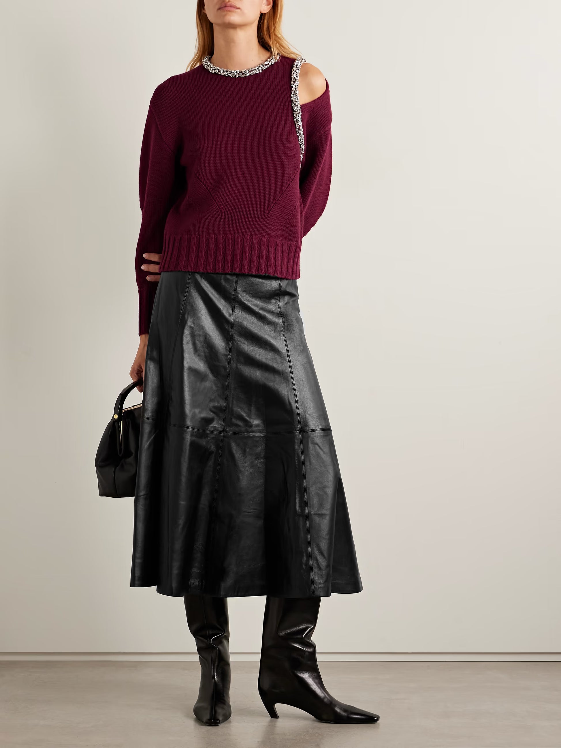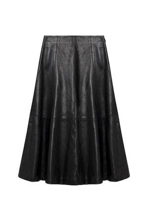 SIMKHAI's Ryma Midi Skirt showcases refined minimalism with its sleek black leather construction. Expertly paneled for a flattering silhouette, this piece sits high at the waist and flows into an elegant flared midi hem. A timeless investment piece that transitions effortlessly from day to evening, offering understated luxury and versatile styling potential.