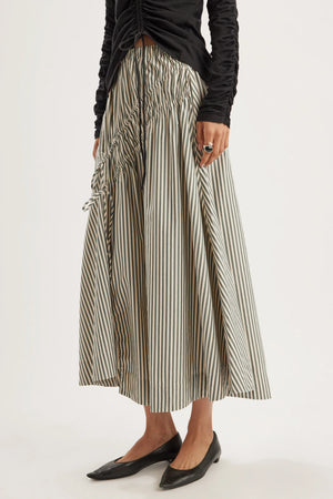 The SABINE Skirt brings effortless elegance to your wardrobe with its graceful midi length and thoughtfully designed details. Featuring a flattering ruched hip treatment and layered hem that creates subtle movement, this piece balances contemporary style with timeless appeal. Crafted from cotton in a refined yard-dyed stripe, the pull-on elasticated waistband ensures all-day comfort without compromising sophistication. Layer it with the REVERIE Top to complete a polished, textured look.