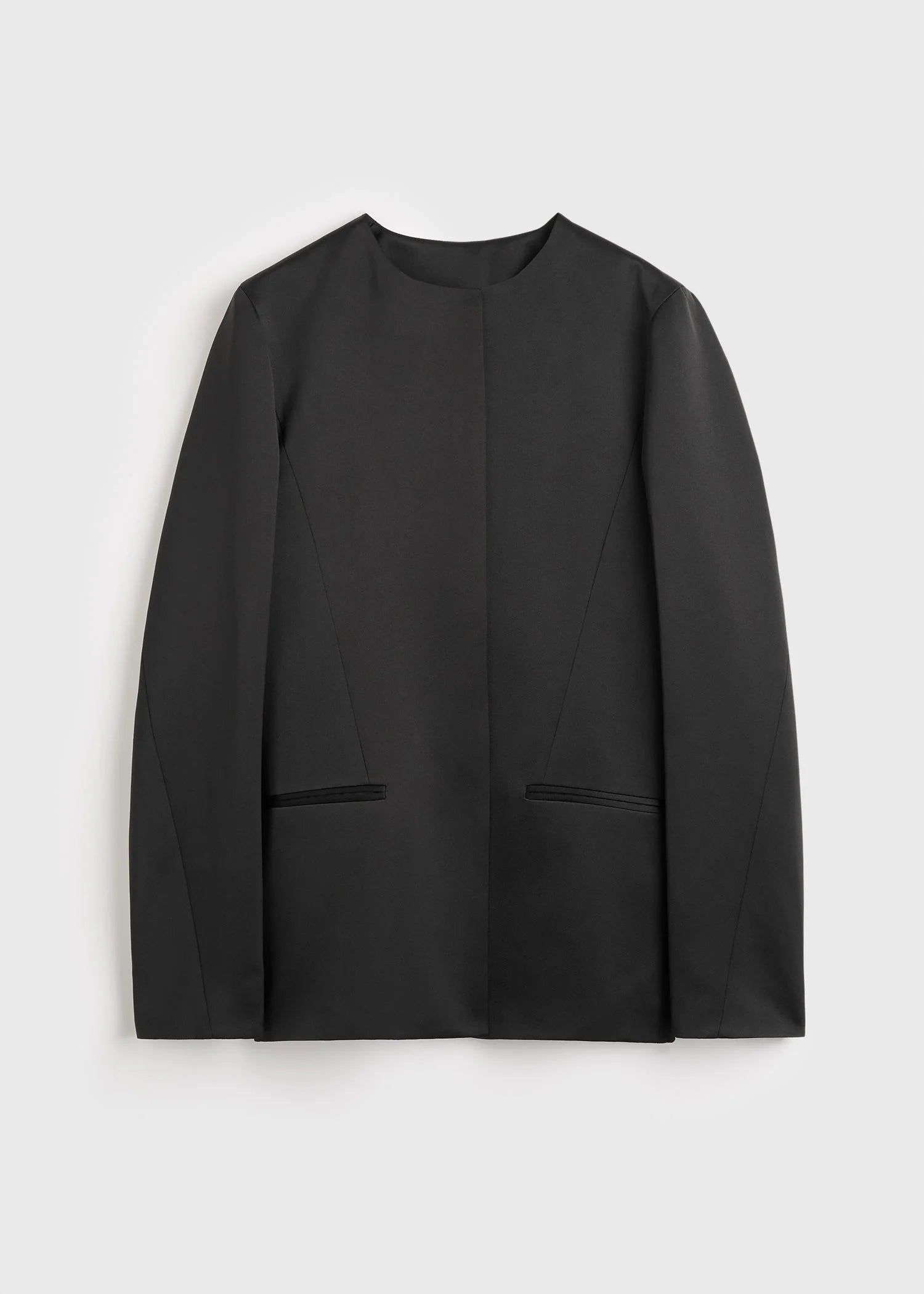 This Satin Dinner Jacket offers a modern, minimalist interpretation of the classic dinner jacket. Crafted from lustrous duchess satin, it features a sleek crew neckline and subtly rounded sleeves with elegant slanted seams. Perfect for pairing with refined evening attire, this jacket elevates your look with understated sophistication.