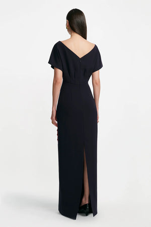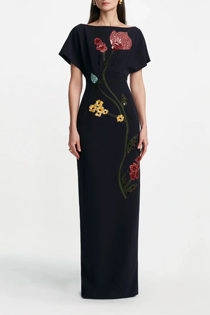 Crafted from our signature crepe, the Savannah Gown showcases a refined column silhouette that flatters with a fitted waist and gathered blouson under bust detailing. Dolman-inspired cape sleeves and an elegant bateau neckline are enhanced by hand-embroidered and beaded desert floral motifs, lending an elevated, sophisticated charm. Designed for a flawless fit, it features a concealed center-back zipper and a comfortable polyester-elastane blend with a smooth lining. Perfect for special occasions, this imported gown requires spot cleaning to maintain its exquisite details.