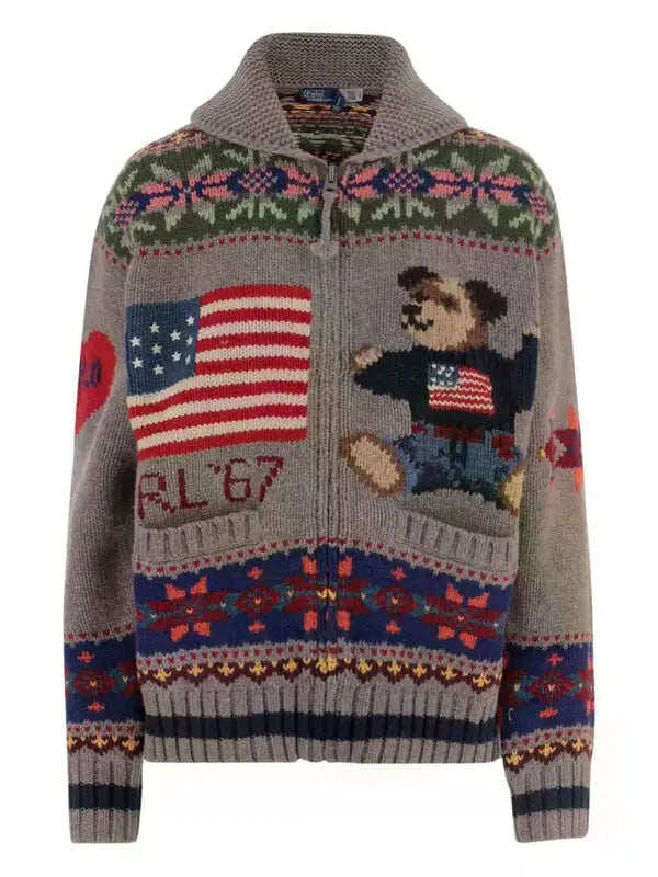 This Polo Ralph Lauren wool cardigan is decorated with intarsia-knit motifs throughout, including Fair Isle–inspired patterns, the Polo Bear, and signature Ralph Lauren logos. The relaxed silhouette features an enveloping shawl collar and full-zip placket