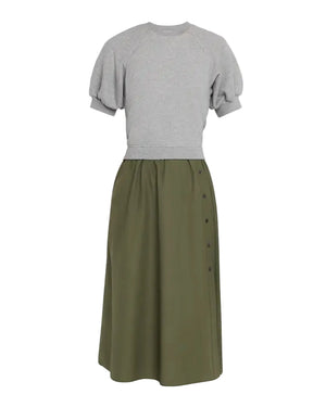 The Shayna dress by Tanya Taylor seamlessly blends comfort with understated elegance. Crafted from soft cotton terry knit, the bodice pairs beautifully with a crisp poplin skirt featuring functional buttons for effortless styling. The crew neckline and short puff sleeves create a refined silhouette, while the relaxed fit ensures all-day wearability. A versatile piece that transitions gracefully from casual to polished occasions.