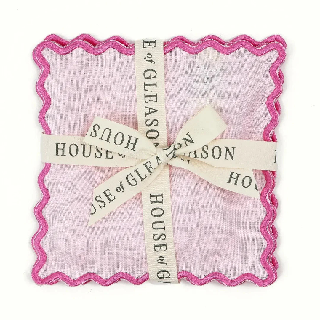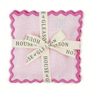 The Vivienne square cocktail napkins bring a touch of refined charm to your smallest sips and bites. Crafted from soft, airy linen with delicately scalloped edges, they add playful elegance to any occasion—from happy hour to after-dinner drinks. Personalization options such as monograms or custom embroidery make them an impeccable finishing touch for your bar cart, party tray, or as a thoughtful hostess gift. This set of four napkins, each measuring 5.25" square, enhances every pour with subtle sophistication.