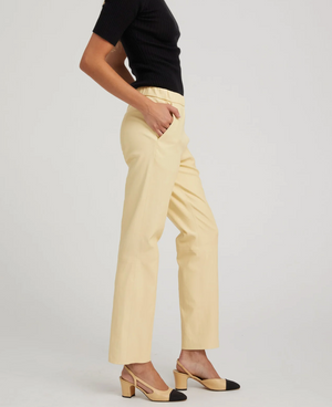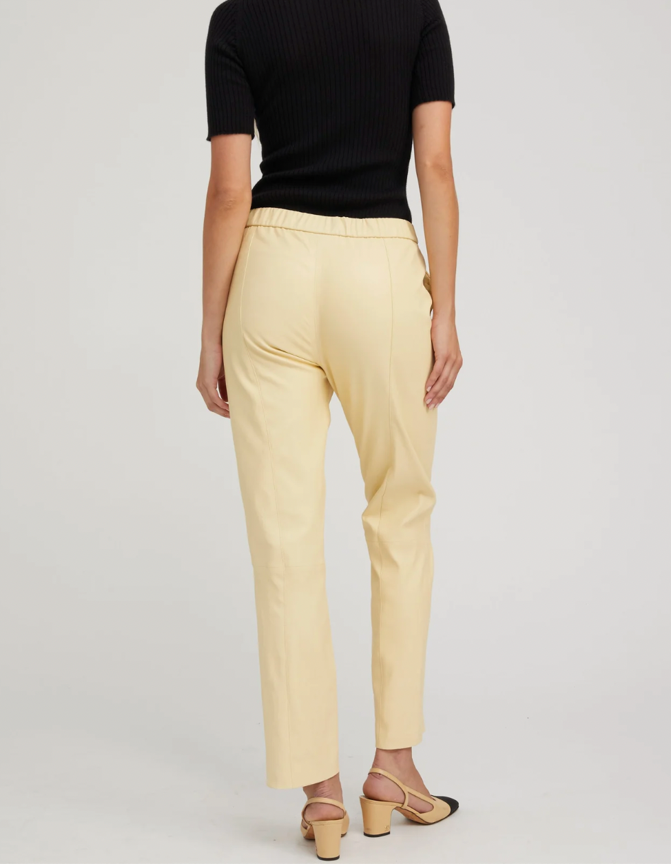 These leather pants combine effortless style with comfort, featuring a relaxed straight-leg silhouette and an elastic-stretch waistband for easy wear. Detailed with pintucks along the front and back, they create a naturally elongating effect suitable for various occasions. Crafted from 100% French lambskin stretch leather with a cotton-lycra lining, they offer a true-to-size fit. Finished with a raw hem, these eco-friendly, hypoallergenic, and chrome-free vegetal-dyed pants require specialist leather cleaning to maintain their quality.