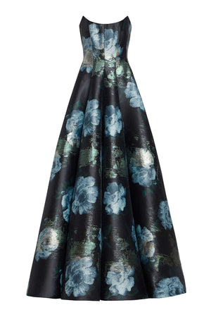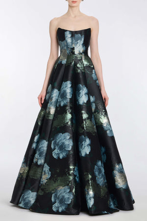 Elegant strapless gown featuring a graceful scoop neckline and voluminous full skirt, crafted for timeless sophistication. The dress is fully lined with luxurious silk and secured with a concealed back zip for a seamless silhouette. Constructed from a premium blend of polyester and metalized polyester, this American-made piece offers both durability and refined shimmer. Dry clean only to maintain its exquisite finish.
