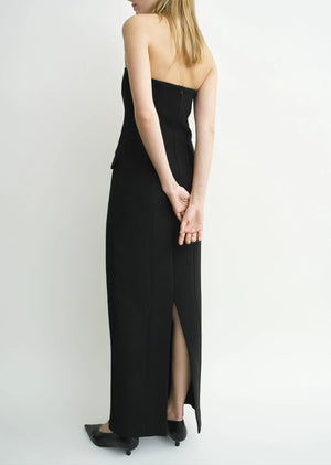 TOTEME'S Strapless Pocket Dress combines elegance with functionality, crafted from mid-weight bonded crepe in a sleek black hue. Its form-fitting, darted design enhances your silhouette, while the strapless cut offers a refined evening look. Practical yet stylish, it features functional pockets, a back zipper, and a slit for ease of movement. Made from 100% recycled polyester, this dress brings sustainable sophistication to your wardrobe.
