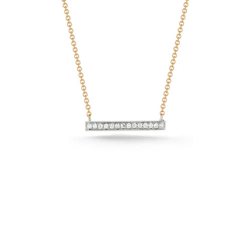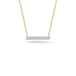 Crafted in 14-karat gold, the Sylvie Rose Medium Bar Necklace features a sleek 17mm by 2mm bar embellished with 0.07 carats of G/H color, SI clarity diamonds. Suspended on a delicate cable chain and secured with a spring ring clasp, this piece offers understated elegance perfect for refined everyday wear or special occasions.