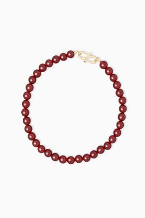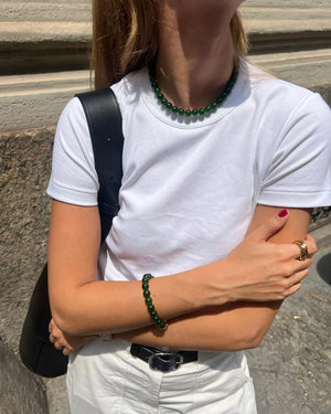 The Mary Necklace features unique Green Agate stones strung on a tone-on-tone colored string, each piece one of a kind due to the natural variations in the stones. Secured with a sculptural 18-carat gold-plated sterling silver lock, it combines natural beauty with refined craftsmanship for a sophisticated look.