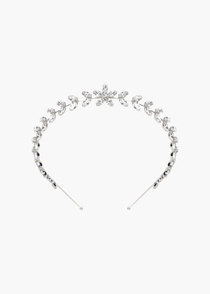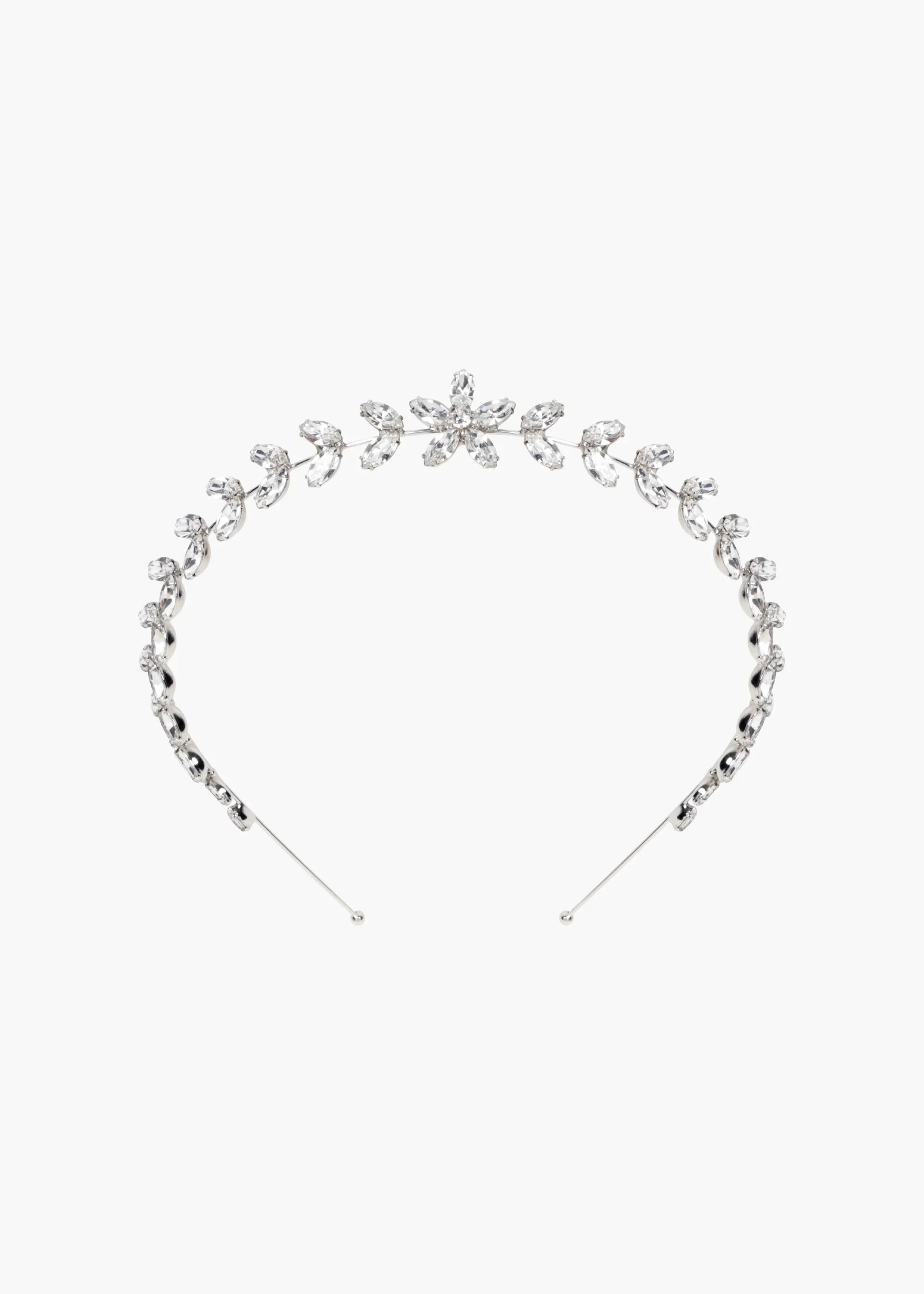 The Vianca Tiara combines celestial and floral inspiration in an elegantly crafted piece designed to enhance your features. Featuring brilliant Swarovski crystals mounted on a discreet, flexible headband, this tiara sits gracefully without slipping or weighing down your hair. Its refined angle flatters the face while catching light beautifully. Measuring 7/8 inches tall with a 14-inch interior circumference, it pairs exquisitely with lace details or coordinates seamlessly with the Verla or Vianca Earrings for a coordinated, sophisticated look.