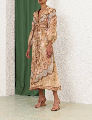 Embrace effortless elegance with the Wanderlust Plunge Midi Dress from our Resort Swim 2026 Collection. Crafted from luxurious 100% linen, this sophisticated midi dress features a striking deep V-neckline and long tubular sleeves with elasticated cuffs for refined movement. The fitted waistband creates a flattering silhouette that flows into a graceful flared skirt, while rouleau button detailing and a concealed centre back zip add polished touches. Fully lined for comfort and confidence, this versatile piece transitions seamlessly from resort getaways to elevated everyday wear.
