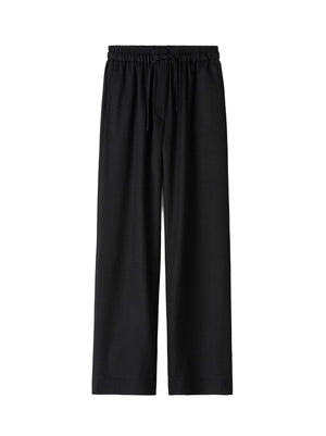 Crafted from a luxurious blend of wool, silk, and cashmere, these woven trousers offer refined elegance with everyday comfort. The straight leg silhouette flatters effortlessly, while the drawstring waist provides adjustable ease. Fluid and graceful, this timeless piece transitions seamlessly from office to evening, delivering understated sophistication in every wear.