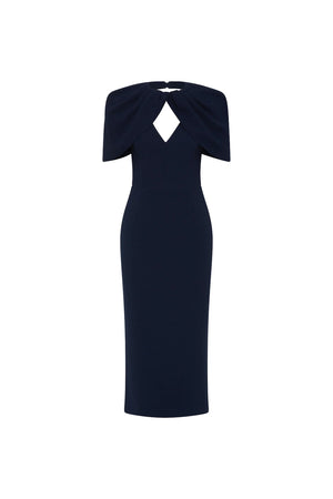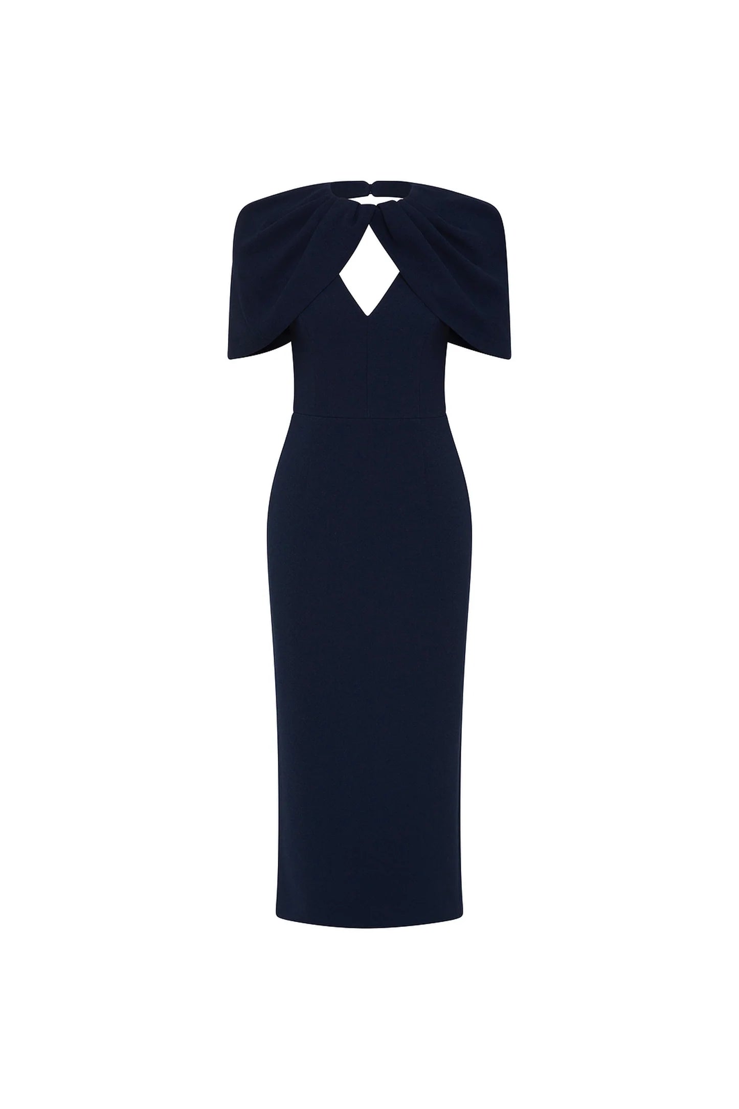 The Xena Midi Dress in navy showcases timeless elegance with its bonded crepe fabric and refined tailoring. Featuring a draped cape overlay and a flattering V neckline, it highlights a fitted bodice with princess seams for a tailored fit. The cinched waist flows into a sleek pencil midi skirt with a back split, enhancing movement and grace. Fully lined and secured with a back zip, this dress offers both comfort and style, making it ideal for sophisticated occasions.