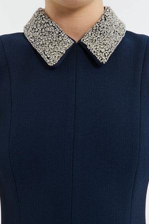 The Xena Short Sleeve Midi Dress in navy exemplifies refined elegance. It showcases a diamante hand-embellished stand collar that adds a subtle sparkle, while the fitted bodice with princess seams shapes a classic, flattering silhouette. A self-belt cinches the waist to enhance the figure, paired with a circular midi skirt featuring practical side seam pockets. Fully lined for smooth comfort, the dress fastens discreetly with an invisible back zip, making it an impeccably polished choice for any sophisticated occasion.